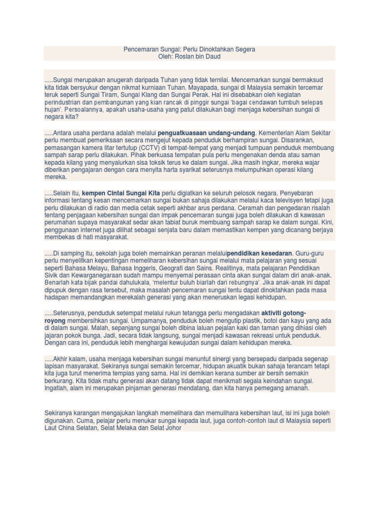 Berikut dikongsikan contoh karangan mengenai usaha-usaha menjaga kebersihan sungai di negara kita. PUNCA-PUNCA PENCEMARAN SUNGAI. Akibat relief permukaan yang tidak rata.
